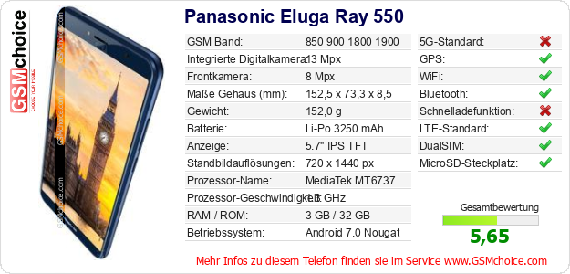 Hast du eigene Webseite? Willst du die Informationen über Standarddaten des Handys Panasonic Eluga Ray 550 irgendwo veröffentlichen? Das ist sehr einfach. Du kannst das Bild herunterladen oder kopieren und auf der Webseite folgenden Code hinzufügen:Das Einfügen von diesem Code verursacht das Anzeigen von dem folgenden Bild: