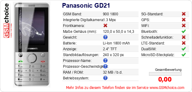 Hast du eigene Webseite? Willst du die Informationen über Standarddaten des Handys Panasonic GD21 irgendwo veröffentlichen? Das ist sehr einfach. Du kannst das Bild herunterladen oder kopieren und auf der Webseite folgenden Code hinzufügen:Das Einfügen von diesem Code verursacht das Anzeigen von dem folgenden Bild: