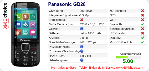 Hast du eigene Webseite? Willst du die Informationen über Standarddaten des Handys Panasonic GD28 irgendwo veröffentlichen? Das ist sehr einfach. Du kannst das Bild herunterladen oder kopieren und auf der Webseite folgenden Code hinzufügen:Das Einfügen von diesem Code verursacht das Anzeigen von dem folgenden Bild: