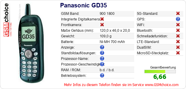 Hast du eigene Webseite? Willst du die Informationen über Standarddaten des Handys Panasonic GD35 irgendwo veröffentlichen? Das ist sehr einfach. Du kannst das Bild herunterladen oder kopieren und auf der Webseite folgenden Code hinzufügen:Das Einfügen von diesem Code verursacht das Anzeigen von dem folgenden Bild: