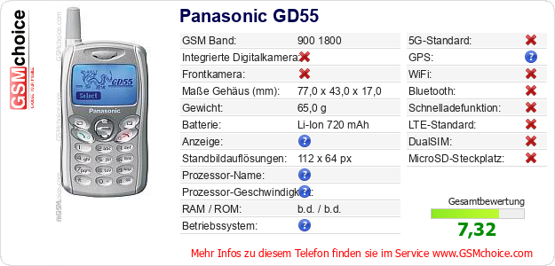 Hast du eigene Webseite? Willst du die Informationen über Standarddaten des Handys Panasonic GD55 irgendwo veröffentlichen? Das ist sehr einfach. Du kannst das Bild herunterladen oder kopieren und auf der Webseite folgenden Code hinzufügen:Das Einfügen von diesem Code verursacht das Anzeigen von dem folgenden Bild: