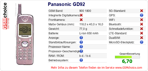 Hast du eigene Webseite? Willst du die Informationen über Standarddaten des Handys Panasonic GD92 irgendwo veröffentlichen? Das ist sehr einfach. Du kannst das Bild herunterladen oder kopieren und auf der Webseite folgenden Code hinzufügen:Das Einfügen von diesem Code verursacht das Anzeigen von dem folgenden Bild: