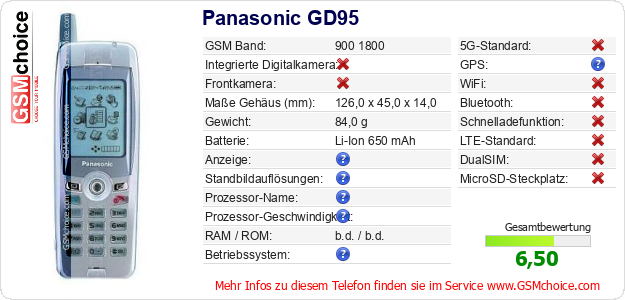 Hast du eigene Webseite? Willst du die Informationen über Standarddaten des Handys Panasonic GD95 irgendwo veröffentlichen? Das ist sehr einfach. Du kannst das Bild herunterladen oder kopieren und auf der Webseite folgenden Code hinzufügen:Das Einfügen von diesem Code verursacht das Anzeigen von dem folgenden Bild:
