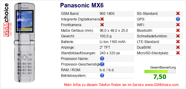 Hast du eigene Webseite? Willst du die Informationen über Standarddaten des Handys Panasonic MX6 irgendwo veröffentlichen? Das ist sehr einfach. Du kannst das Bild herunterladen oder kopieren und auf der Webseite folgenden Code hinzufügen:Das Einfügen von diesem Code verursacht das Anzeigen von dem folgenden Bild: