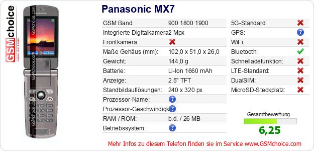 Hast du eigene Webseite? Willst du die Informationen über Standarddaten des Handys Panasonic MX7 irgendwo veröffentlichen? Das ist sehr einfach. Du kannst das Bild herunterladen oder kopieren und auf der Webseite folgenden Code hinzufügen:Das Einfügen von diesem Code verursacht das Anzeigen von dem folgenden Bild:
