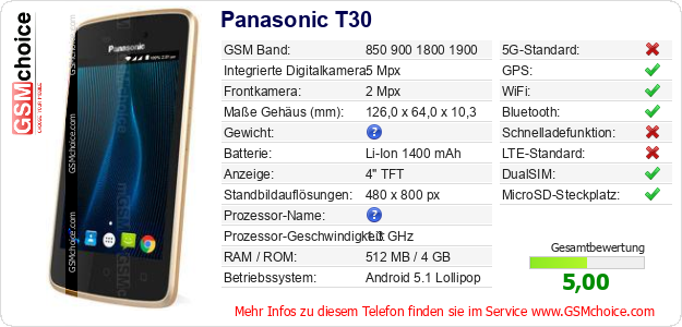 Hast du eigene Webseite? Willst du die Informationen über Standarddaten des Handys Panasonic T30 irgendwo veröffentlichen? Das ist sehr einfach. Du kannst das Bild herunterladen oder kopieren und auf der Webseite folgenden Code hinzufügen:Das Einfügen von diesem Code verursacht das Anzeigen von dem folgenden Bild: