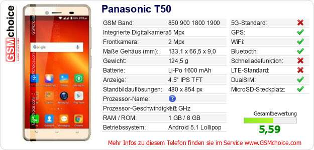 Hast du eigene Webseite? Willst du die Informationen über Standarddaten des Handys Panasonic T50 irgendwo veröffentlichen? Das ist sehr einfach. Du kannst das Bild herunterladen oder kopieren und auf der Webseite folgenden Code hinzufügen:Das Einfügen von diesem Code verursacht das Anzeigen von dem folgenden Bild:
