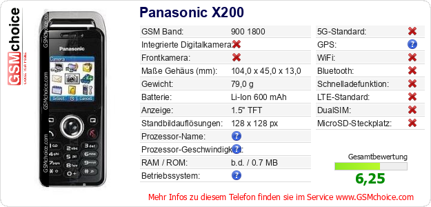 Hast du eigene Webseite? Willst du die Informationen über Standarddaten des Handys Panasonic X200 irgendwo veröffentlichen? Das ist sehr einfach. Du kannst das Bild herunterladen oder kopieren und auf der Webseite folgenden Code hinzufügen:Das Einfügen von diesem Code verursacht das Anzeigen von dem folgenden Bild: