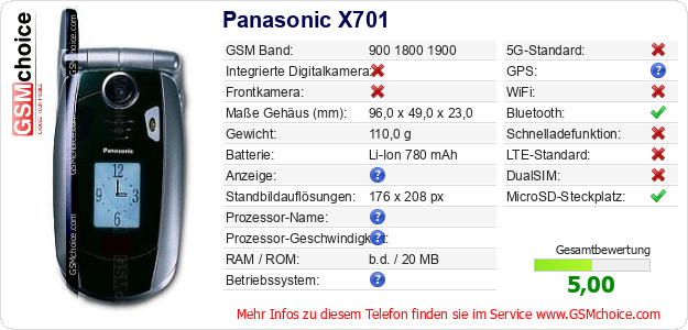 Hast du eigene Webseite? Willst du die Informationen über Standarddaten des Handys Panasonic X701 irgendwo veröffentlichen? Das ist sehr einfach. Du kannst das Bild herunterladen oder kopieren und auf der Webseite folgenden Code hinzufügen:Das Einfügen von diesem Code verursacht das Anzeigen von dem folgenden Bild: