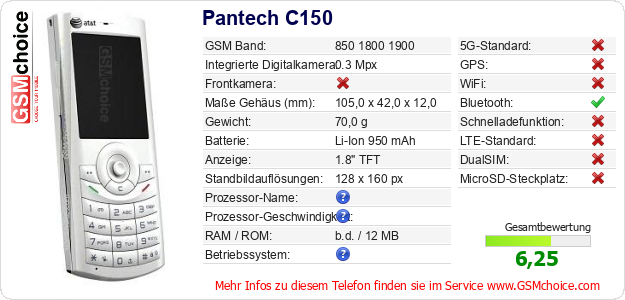 Hast du eigene Webseite? Willst du die Informationen über Standarddaten des Handys Pantech C150 irgendwo veröffentlichen? Das ist sehr einfach. Du kannst das Bild herunterladen oder kopieren und auf der Webseite folgenden Code hinzufügen:Das Einfügen von diesem Code verursacht das Anzeigen von dem folgenden Bild: