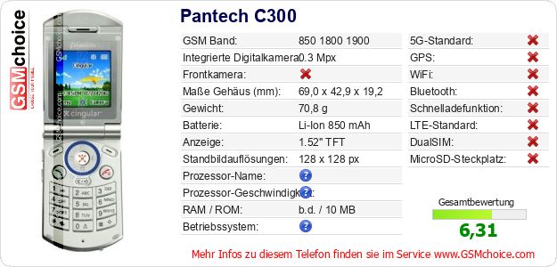 Hast du eigene Webseite? Willst du die Informationen über Standarddaten des Handys Pantech C300 irgendwo veröffentlichen? Das ist sehr einfach. Du kannst das Bild herunterladen oder kopieren und auf der Webseite folgenden Code hinzufügen:Das Einfügen von diesem Code verursacht das Anzeigen von dem folgenden Bild: