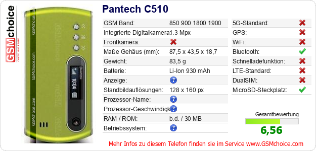 Hast du eigene Webseite? Willst du die Informationen über Standarddaten des Handys Pantech C510 irgendwo veröffentlichen? Das ist sehr einfach. Du kannst das Bild herunterladen oder kopieren und auf der Webseite folgenden Code hinzufügen:Das Einfügen von diesem Code verursacht das Anzeigen von dem folgenden Bild: