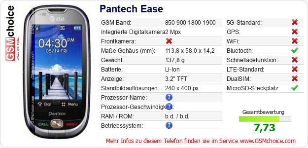 Hast du eigene Webseite? Willst du die Informationen über Standarddaten des Handys Pantech Ease irgendwo veröffentlichen? Das ist sehr einfach. Du kannst das Bild herunterladen oder kopieren und auf der Webseite folgenden Code hinzufügen:Das Einfügen von diesem Code verursacht das Anzeigen von dem folgenden Bild: