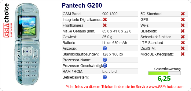 Hast du eigene Webseite? Willst du die Informationen über Standarddaten des Handys Pantech G200 irgendwo veröffentlichen? Das ist sehr einfach. Du kannst das Bild herunterladen oder kopieren und auf der Webseite folgenden Code hinzufügen:Das Einfügen von diesem Code verursacht das Anzeigen von dem folgenden Bild: