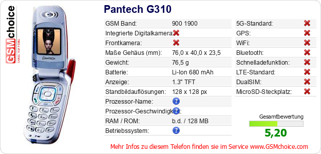 Hast du eigene Webseite? Willst du die Informationen über Standarddaten des Handys Pantech G310 irgendwo veröffentlichen? Das ist sehr einfach. Du kannst das Bild herunterladen oder kopieren und auf der Webseite folgenden Code hinzufügen:Das Einfügen von diesem Code verursacht das Anzeigen von dem folgenden Bild: