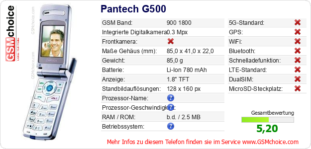 Hast du eigene Webseite? Willst du die Informationen über Standarddaten des Handys Pantech G500 irgendwo veröffentlichen? Das ist sehr einfach. Du kannst das Bild herunterladen oder kopieren und auf der Webseite folgenden Code hinzufügen:Das Einfügen von diesem Code verursacht das Anzeigen von dem folgenden Bild:
