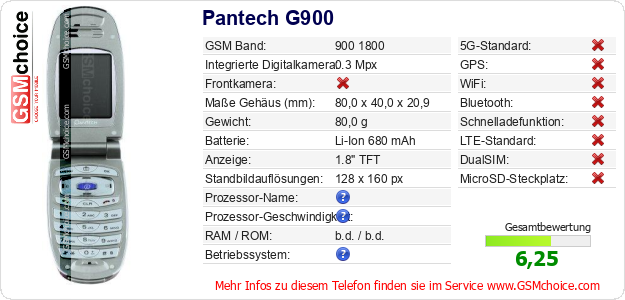 Hast du eigene Webseite? Willst du die Informationen über Standarddaten des Handys Pantech G900 irgendwo veröffentlichen? Das ist sehr einfach. Du kannst das Bild herunterladen oder kopieren und auf der Webseite folgenden Code hinzufügen:Das Einfügen von diesem Code verursacht das Anzeigen von dem folgenden Bild:
