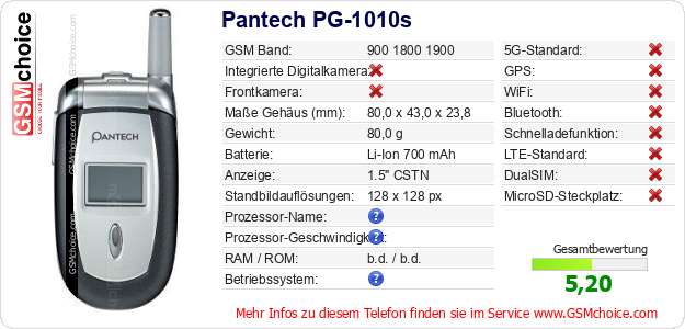 Hast du eigene Webseite? Willst du die Informationen über Standarddaten des Handys Pantech PG-1010s irgendwo veröffentlichen? Das ist sehr einfach. Du kannst das Bild herunterladen oder kopieren und auf der Webseite folgenden Code hinzufügen:Das Einfügen von diesem Code verursacht das Anzeigen von dem folgenden Bild: