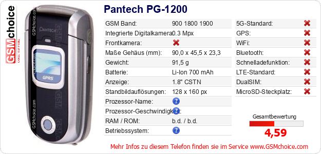 Hast du eigene Webseite? Willst du die Informationen über Standarddaten des Handys Pantech PG-1200 irgendwo veröffentlichen? Das ist sehr einfach. Du kannst das Bild herunterladen oder kopieren und auf der Webseite folgenden Code hinzufügen:Das Einfügen von diesem Code verursacht das Anzeigen von dem folgenden Bild: