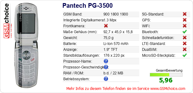 Hast du eigene Webseite? Willst du die Informationen über Standarddaten des Handys Pantech PG-3500 irgendwo veröffentlichen? Das ist sehr einfach. Du kannst das Bild herunterladen oder kopieren und auf der Webseite folgenden Code hinzufügen:Das Einfügen von diesem Code verursacht das Anzeigen von dem folgenden Bild: