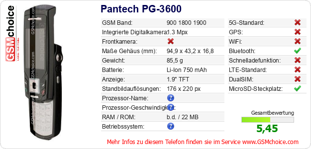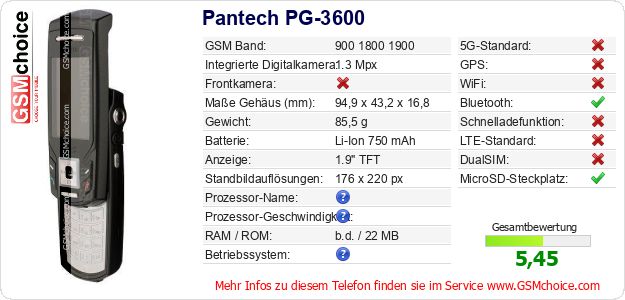 Hast du eigene Webseite? Willst du die Informationen über Standarddaten des Handys Pantech PG-3600 irgendwo veröffentlichen? Das ist sehr einfach. Du kannst das Bild herunterladen oder kopieren und auf der Webseite folgenden Code hinzufügen:Das Einfügen von diesem Code verursacht das Anzeigen von dem folgenden Bild: