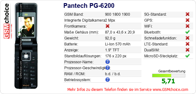 Hast du eigene Webseite? Willst du die Informationen über Standarddaten des Handys Pantech PG-6200 irgendwo veröffentlichen? Das ist sehr einfach. Du kannst das Bild herunterladen oder kopieren und auf der Webseite folgenden Code hinzufügen:Das Einfügen von diesem Code verursacht das Anzeigen von dem folgenden Bild: