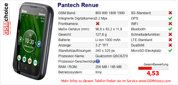 Hast du eigene Webseite? Willst du die Informationen über Standarddaten des Handys Pantech Renue irgendwo veröffentlichen? Das ist sehr einfach. Du kannst das Bild herunterladen oder kopieren und auf der Webseite folgenden Code hinzufügen:Das Einfügen von diesem Code verursacht das Anzeigen von dem folgenden Bild: