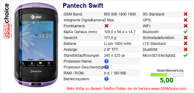 Hast du eigene Webseite? Willst du die Informationen über Standarddaten des Handys Pantech Swift irgendwo veröffentlichen? Das ist sehr einfach. Du kannst das Bild herunterladen oder kopieren und auf der Webseite folgenden Code hinzufügen:Das Einfügen von diesem Code verursacht das Anzeigen von dem folgenden Bild: