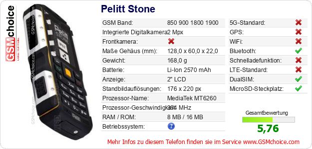 Hast du eigene Webseite? Willst du die Informationen über Standarddaten des Handys Pelitt Stone irgendwo veröffentlichen? Das ist sehr einfach. Du kannst das Bild herunterladen oder kopieren und auf der Webseite folgenden Code hinzufügen:Das Einfügen von diesem Code verursacht das Anzeigen von dem folgenden Bild: