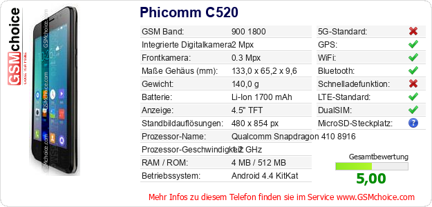 Hast du eigene Webseite? Willst du die Informationen über Standarddaten des Handys Phicomm C520 irgendwo veröffentlichen? Das ist sehr einfach. Du kannst das Bild herunterladen oder kopieren und auf der Webseite folgenden Code hinzufügen:Das Einfügen von diesem Code verursacht das Anzeigen von dem folgenden Bild: