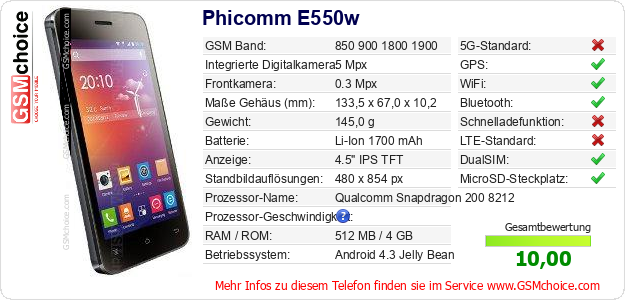 Daten des Mobiltelefons Phicomm E550w auf Ihrer Seite