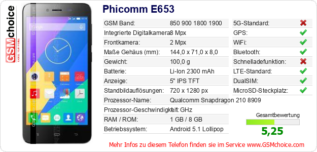 Hast du eigene Webseite? Willst du die Informationen über Standarddaten des Handys Phicomm E653 irgendwo veröffentlichen? Das ist sehr einfach. Du kannst das Bild herunterladen oder kopieren und auf der Webseite folgenden Code hinzufügen:Das Einfügen von diesem Code verursacht das Anzeigen von dem folgenden Bild: