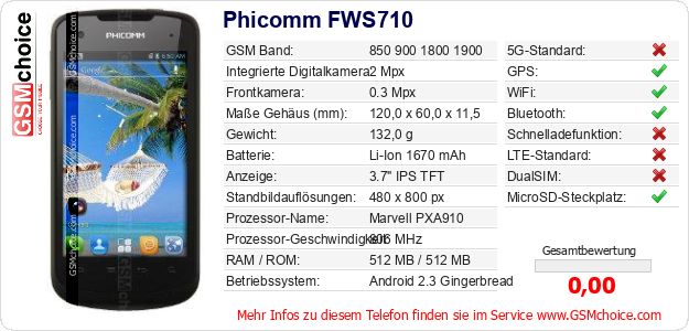 Hast du eigene Webseite? Willst du die Informationen über Standarddaten des Handys Phicomm FWS710 irgendwo veröffentlichen? Das ist sehr einfach. Du kannst das Bild herunterladen oder kopieren und auf der Webseite folgenden Code hinzufügen:Das Einfügen von diesem Code verursacht das Anzeigen von dem folgenden Bild: