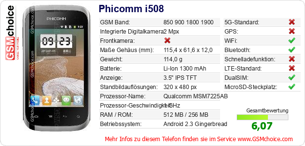 Hast du eigene Webseite? Willst du die Informationen über Standarddaten des Handys Phicomm i508 irgendwo veröffentlichen? Das ist sehr einfach. Du kannst das Bild herunterladen oder kopieren und auf der Webseite folgenden Code hinzufügen:Das Einfügen von diesem Code verursacht das Anzeigen von dem folgenden Bild: