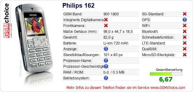 Hast du eigene Webseite? Willst du die Informationen über Standarddaten des Handys Philips 162 irgendwo veröffentlichen? Das ist sehr einfach. Du kannst das Bild herunterladen oder kopieren und auf der Webseite folgenden Code hinzufügen:Das Einfügen von diesem Code verursacht das Anzeigen von dem folgenden Bild: