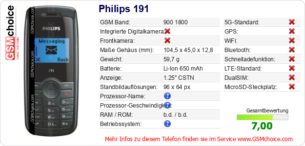 Hast du eigene Webseite? Willst du die Informationen über Standarddaten des Handys Philips 191 irgendwo veröffentlichen? Das ist sehr einfach. Du kannst das Bild herunterladen oder kopieren und auf der Webseite folgenden Code hinzufügen:Das Einfügen von diesem Code verursacht das Anzeigen von dem folgenden Bild: