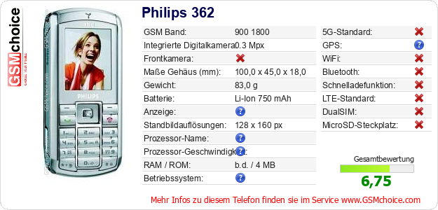 Hast du eigene Webseite? Willst du die Informationen über Standarddaten des Handys Philips 362 irgendwo veröffentlichen? Das ist sehr einfach. Du kannst das Bild herunterladen oder kopieren und auf der Webseite folgenden Code hinzufügen:Das Einfügen von diesem Code verursacht das Anzeigen von dem folgenden Bild:
