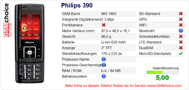 Hast du eigene Webseite? Willst du die Informationen über Standarddaten des Handys Philips 390 irgendwo veröffentlichen? Das ist sehr einfach. Du kannst das Bild herunterladen oder kopieren und auf der Webseite folgenden Code hinzufügen:Das Einfügen von diesem Code verursacht das Anzeigen von dem folgenden Bild: