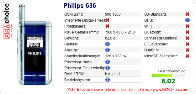 Hast du eigene Webseite? Willst du die Informationen über Standarddaten des Handys Philips 636 irgendwo veröffentlichen? Das ist sehr einfach. Du kannst das Bild herunterladen oder kopieren und auf der Webseite folgenden Code hinzufügen:Das Einfügen von diesem Code verursacht das Anzeigen von dem folgenden Bild: