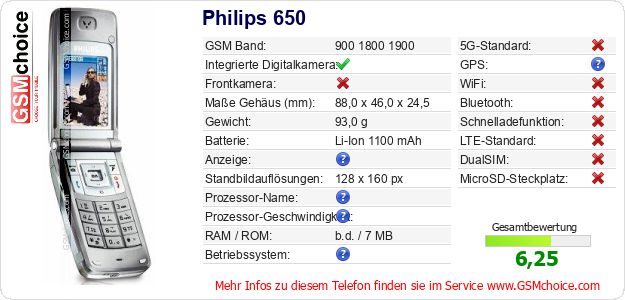 Hast du eigene Webseite? Willst du die Informationen über Standarddaten des Handys Philips 650 irgendwo veröffentlichen? Das ist sehr einfach. Du kannst das Bild herunterladen oder kopieren und auf der Webseite folgenden Code hinzufügen:Das Einfügen von diesem Code verursacht das Anzeigen von dem folgenden Bild: