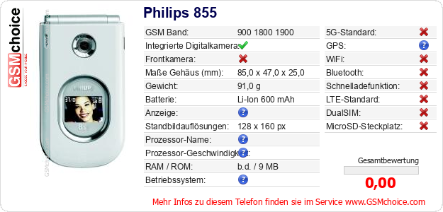 Hast du eigene Webseite? Willst du die Informationen über Standarddaten des Handys Philips 855 irgendwo veröffentlichen? Das ist sehr einfach. Du kannst das Bild herunterladen oder kopieren und auf der Webseite folgenden Code hinzufügen:Das Einfügen von diesem Code verursacht das Anzeigen von dem folgenden Bild: