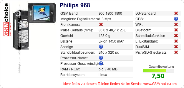 Hast du eigene Webseite? Willst du die Informationen über Standarddaten des Handys Philips 968 irgendwo veröffentlichen? Das ist sehr einfach. Du kannst das Bild herunterladen oder kopieren und auf der Webseite folgenden Code hinzufügen:Das Einfügen von diesem Code verursacht das Anzeigen von dem folgenden Bild: