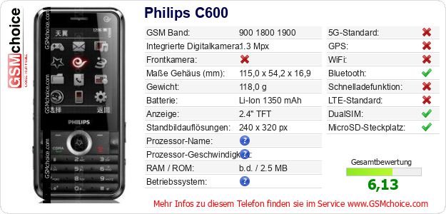 Hast du eigene Webseite? Willst du die Informationen über Standarddaten des Handys Philips C600 irgendwo veröffentlichen? Das ist sehr einfach. Du kannst das Bild herunterladen oder kopieren und auf der Webseite folgenden Code hinzufügen:Das Einfügen von diesem Code verursacht das Anzeigen von dem folgenden Bild:
