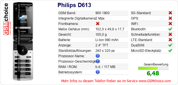 Hast du eigene Webseite? Willst du die Informationen über Standarddaten des Handys Philips D613 irgendwo veröffentlichen? Das ist sehr einfach. Du kannst das Bild herunterladen oder kopieren und auf der Webseite folgenden Code hinzufügen:Das Einfügen von diesem Code verursacht das Anzeigen von dem folgenden Bild: