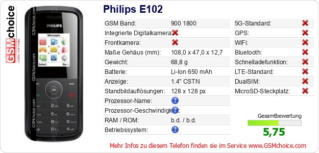 Hast du eigene Webseite? Willst du die Informationen über Standarddaten des Handys Philips E102 irgendwo veröffentlichen? Das ist sehr einfach. Du kannst das Bild herunterladen oder kopieren und auf der Webseite folgenden Code hinzufügen:Das Einfügen von diesem Code verursacht das Anzeigen von dem folgenden Bild: