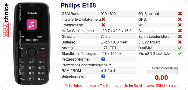 Hast du eigene Webseite? Willst du die Informationen über Standarddaten des Handys Philips E108 irgendwo veröffentlichen? Das ist sehr einfach. Du kannst das Bild herunterladen oder kopieren und auf der Webseite folgenden Code hinzufügen:Das Einfügen von diesem Code verursacht das Anzeigen von dem folgenden Bild: