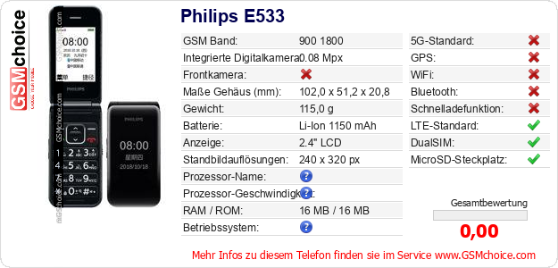 Hast du eigene Webseite? Willst du die Informationen über Standarddaten des Handys Philips E533 irgendwo veröffentlichen? Das ist sehr einfach. Du kannst das Bild herunterladen oder kopieren und auf der Webseite folgenden Code hinzufügen:Das Einfügen von diesem Code verursacht das Anzeigen von dem folgenden Bild: