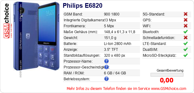 Hast du eigene Webseite? Willst du die Informationen über Standarddaten des Handys Philips E6820 irgendwo veröffentlichen? Das ist sehr einfach. Du kannst das Bild herunterladen oder kopieren und auf der Webseite folgenden Code hinzufügen:Das Einfügen von diesem Code verursacht das Anzeigen von dem folgenden Bild: