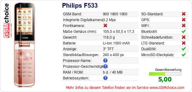 Hast du eigene Webseite? Willst du die Informationen über Standarddaten des Handys Philips F533 irgendwo veröffentlichen? Das ist sehr einfach. Du kannst das Bild herunterladen oder kopieren und auf der Webseite folgenden Code hinzufügen:Das Einfügen von diesem Code verursacht das Anzeigen von dem folgenden Bild: