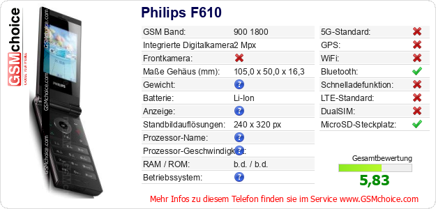 Hast du eigene Webseite? Willst du die Informationen über Standarddaten des Handys Philips F610 irgendwo veröffentlichen? Das ist sehr einfach. Du kannst das Bild herunterladen oder kopieren und auf der Webseite folgenden Code hinzufügen:Das Einfügen von diesem Code verursacht das Anzeigen von dem folgenden Bild: